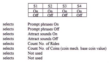 | The following diagram illustrates the general configuration of the SW3 switch which controls the Access Kiddie Ride Unit’s attraction sounds and other ancillary functions. |